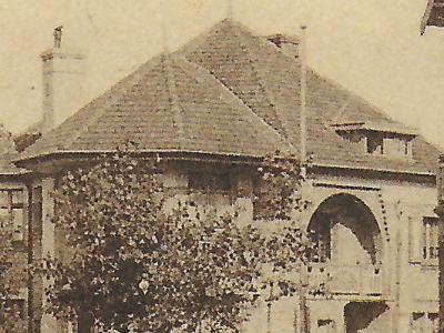 Trois éléments caractérisent ici le style cottage : l'utilisation fréquente de boiseries peintes, le jeu avec le volume du toit et l'embellissement de la façade par des pans de mur en retrait et en saillie.