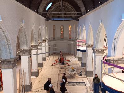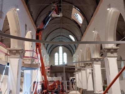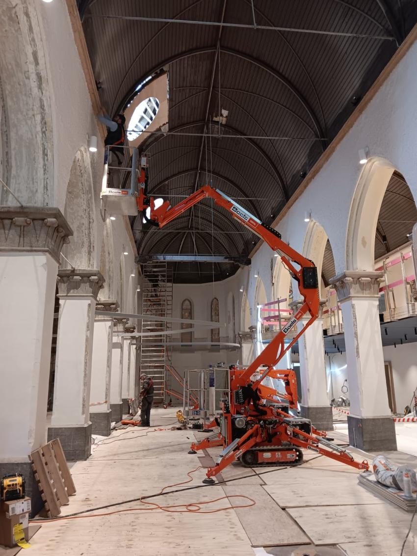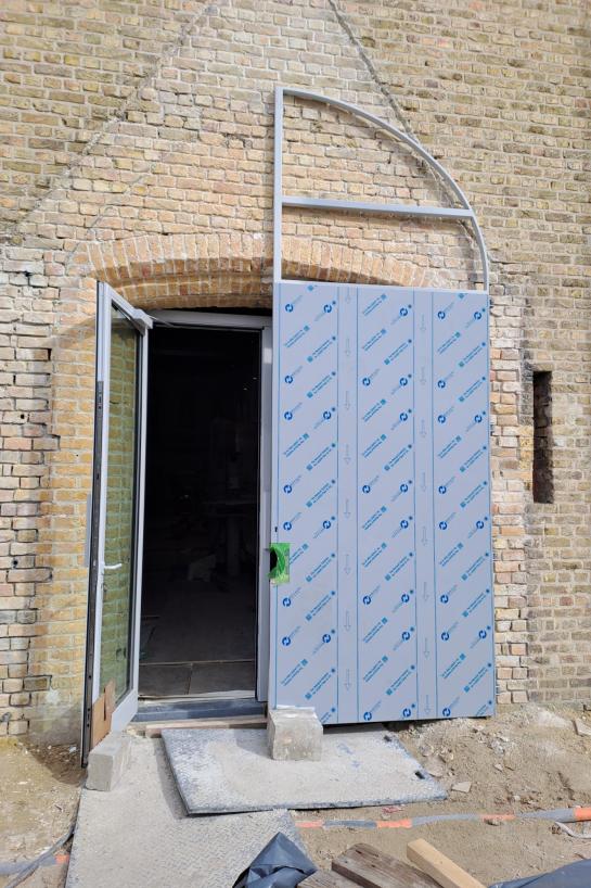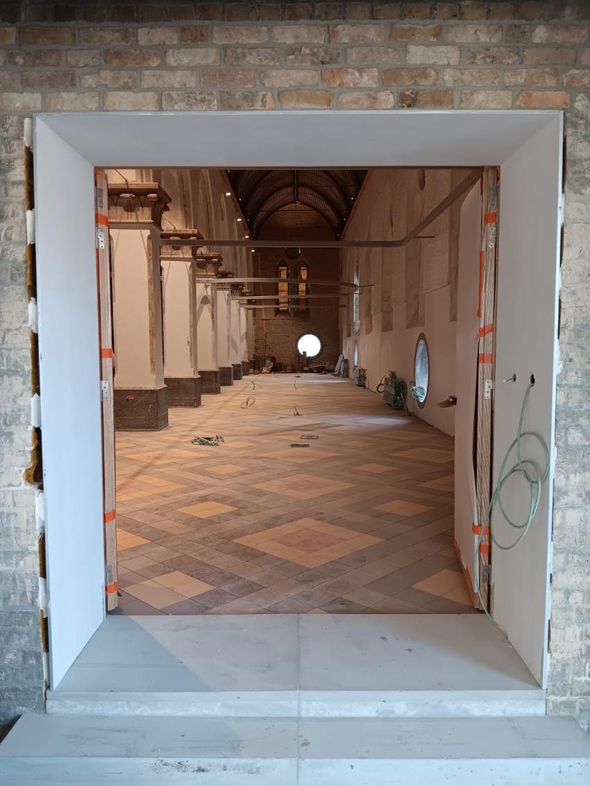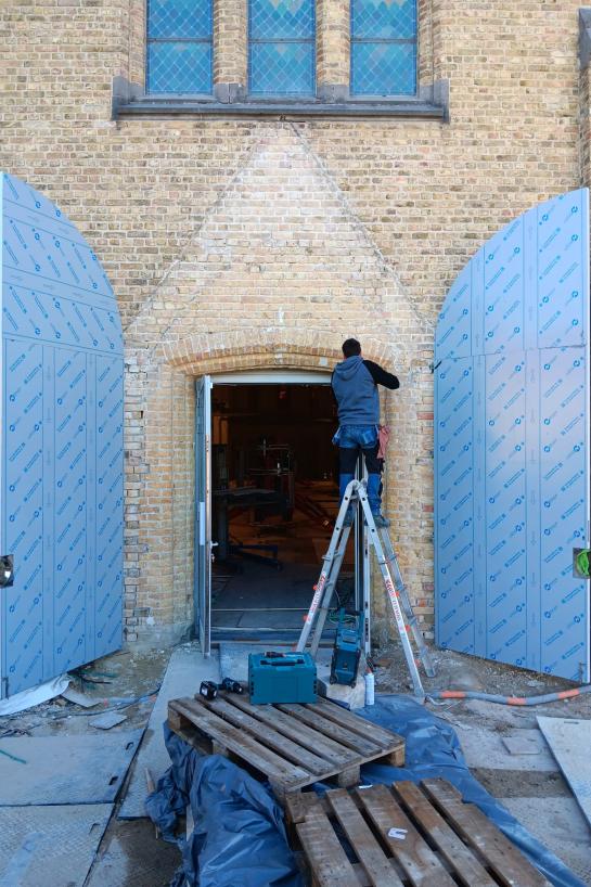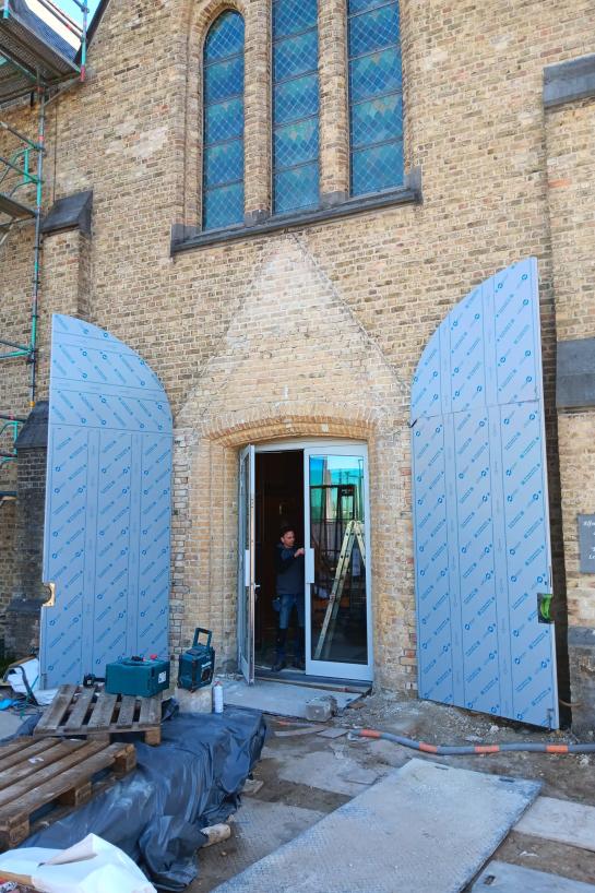 Een opvallend element dat 'as we speak' zijn plaats krijgt, is de grote deur aan de hoofdingang van het kerkgebouw. Deze eyecatcher zal bezoekers als het ware uitnodigen en verwelkomen in de nieuwe bib.