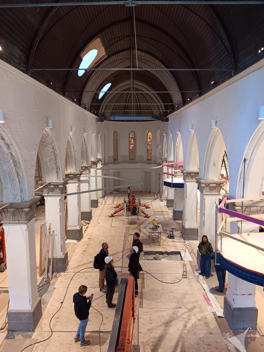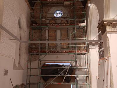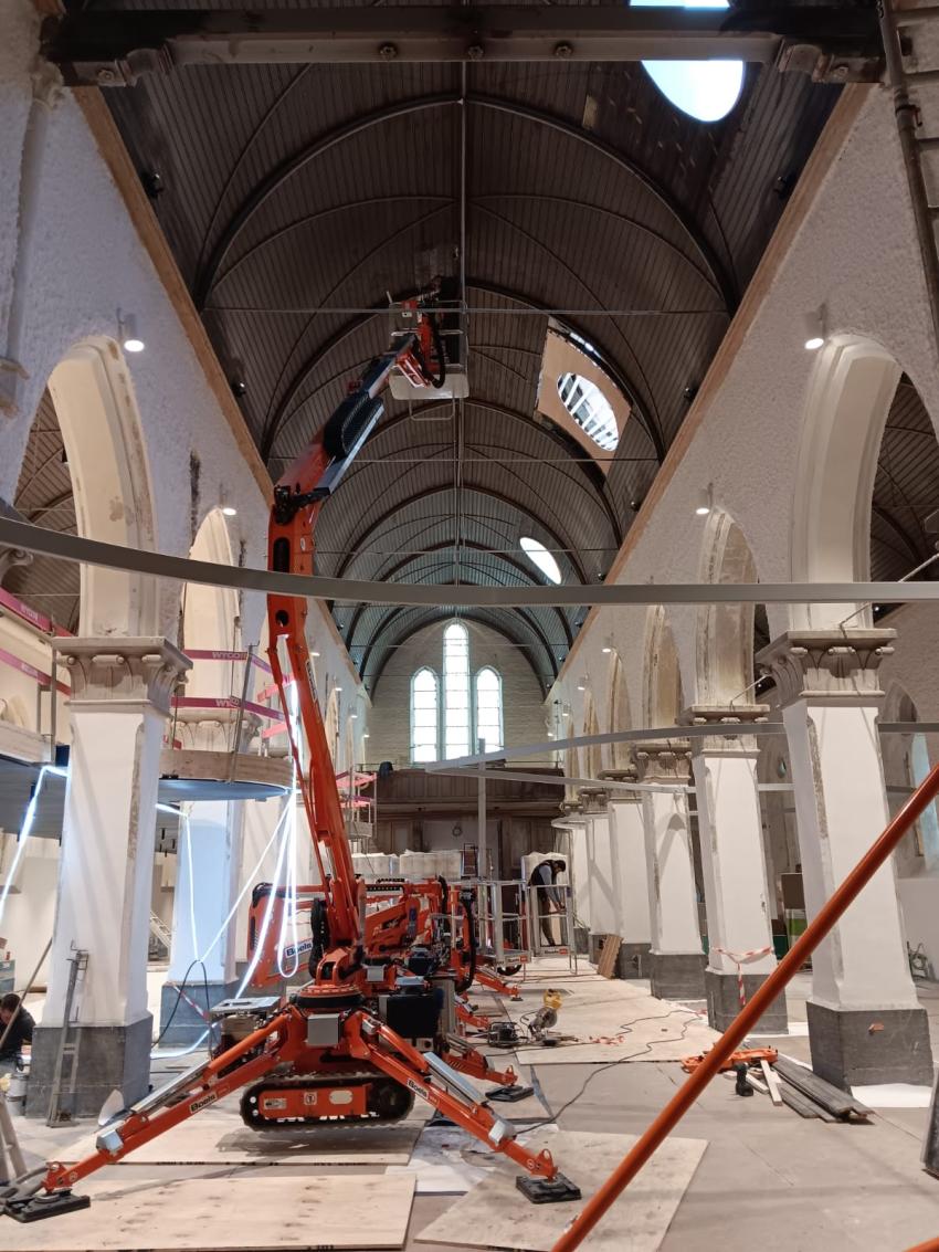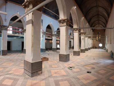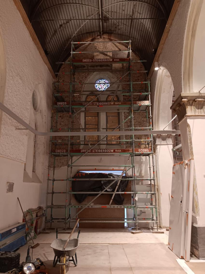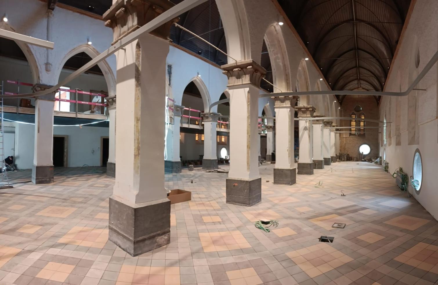 Een opvallend element dat 'as we speak' zijn plaats krijgt, is de grote deur aan de hoofdingang van het kerkgebouw. Deze eyecatcher zal bezoekers als het ware uitnodigen en verwelkomen in de nieuwe bib.