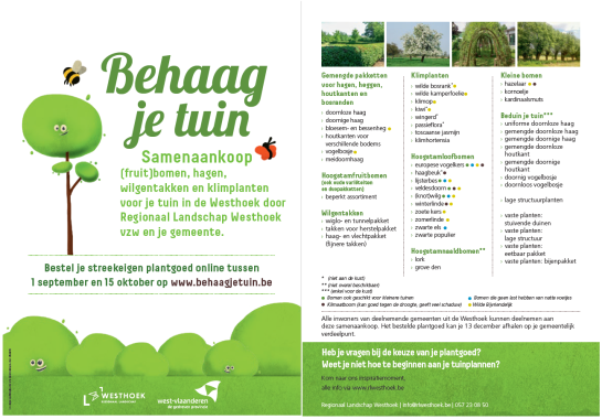 Doe mee aan de samenaankoop ‘Behaag je tuin’, waarbij je (fruit)bomen, hagen, wilgentakken en klimplanten kunt bestellen. Kwaliteitsvol, streekeigen plantgoed aan een goede prijs.