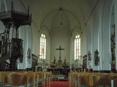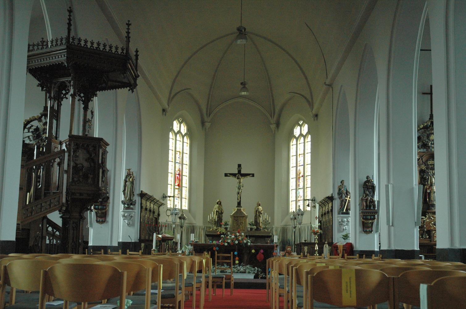 The church has an austere, plastered and white interior. The high choir is graced with beautiful carved oak wall panelling and seats. The high altar is made from white stone and is dedicated to Saint Audomarus. The stained glass windows are striking. These were added in 1953-54 and have a 'modern' look. The Sint-Audomaruskerk in Adinkerke has a number of beautiful church treasures.