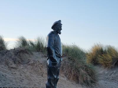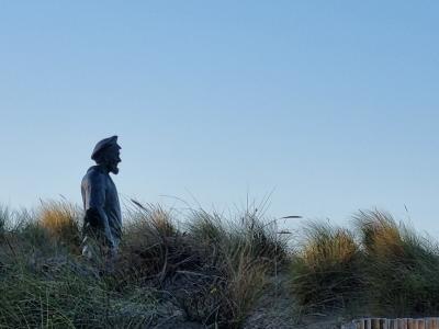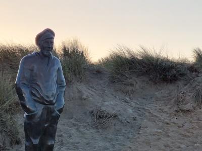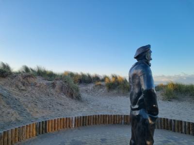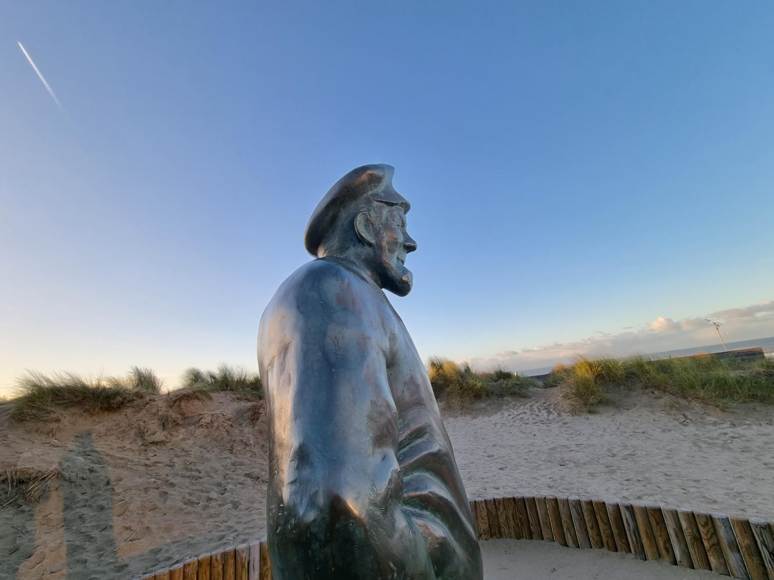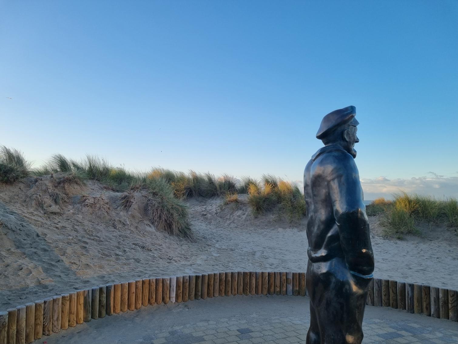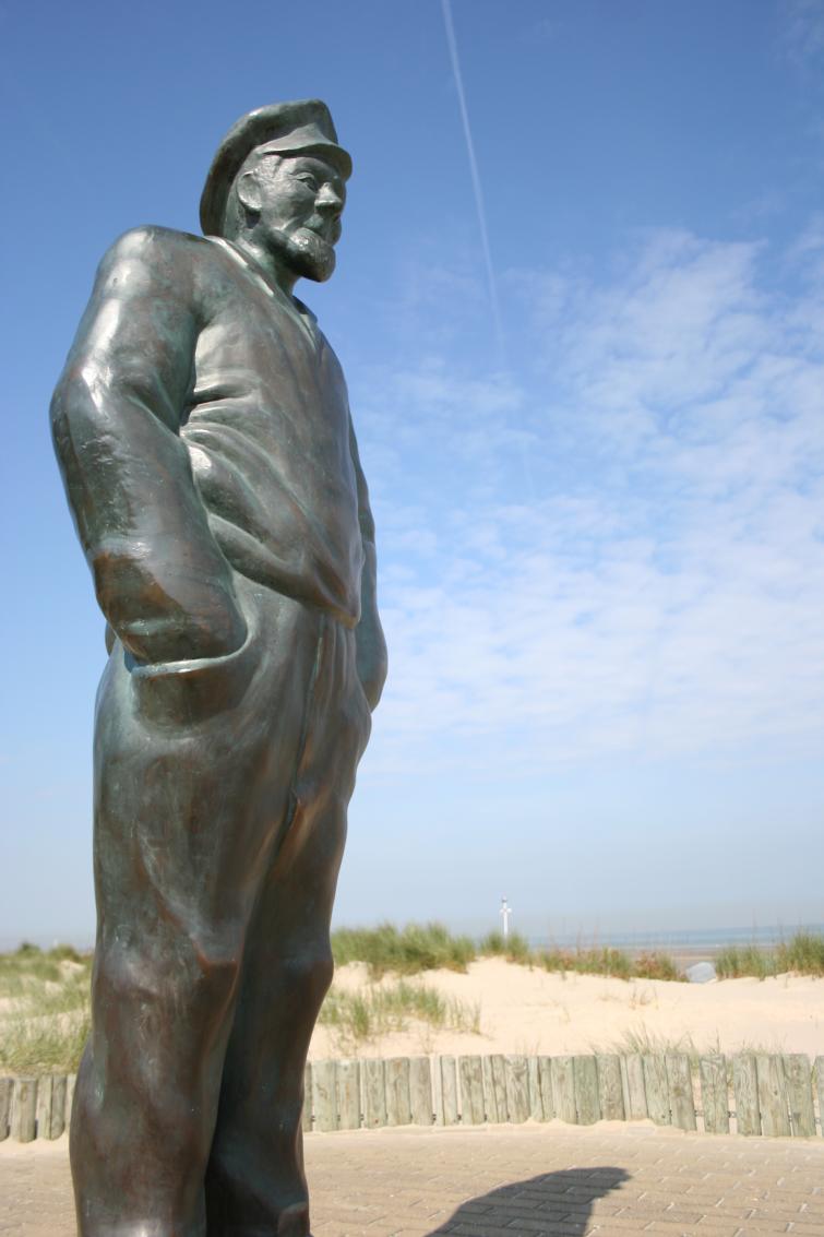 Au bord de la plage, Pier Kloeffe (Petrus Decreton) scrute l’horizon en habits de pêcheur au milieu des dunes. La statue en bronze est devenue la figure de proue de la pêche à De Panne.