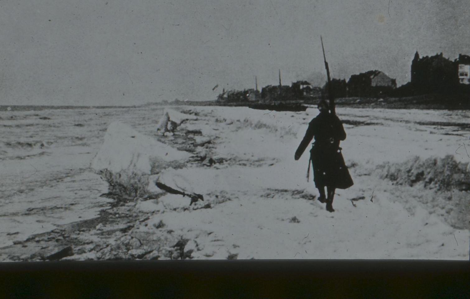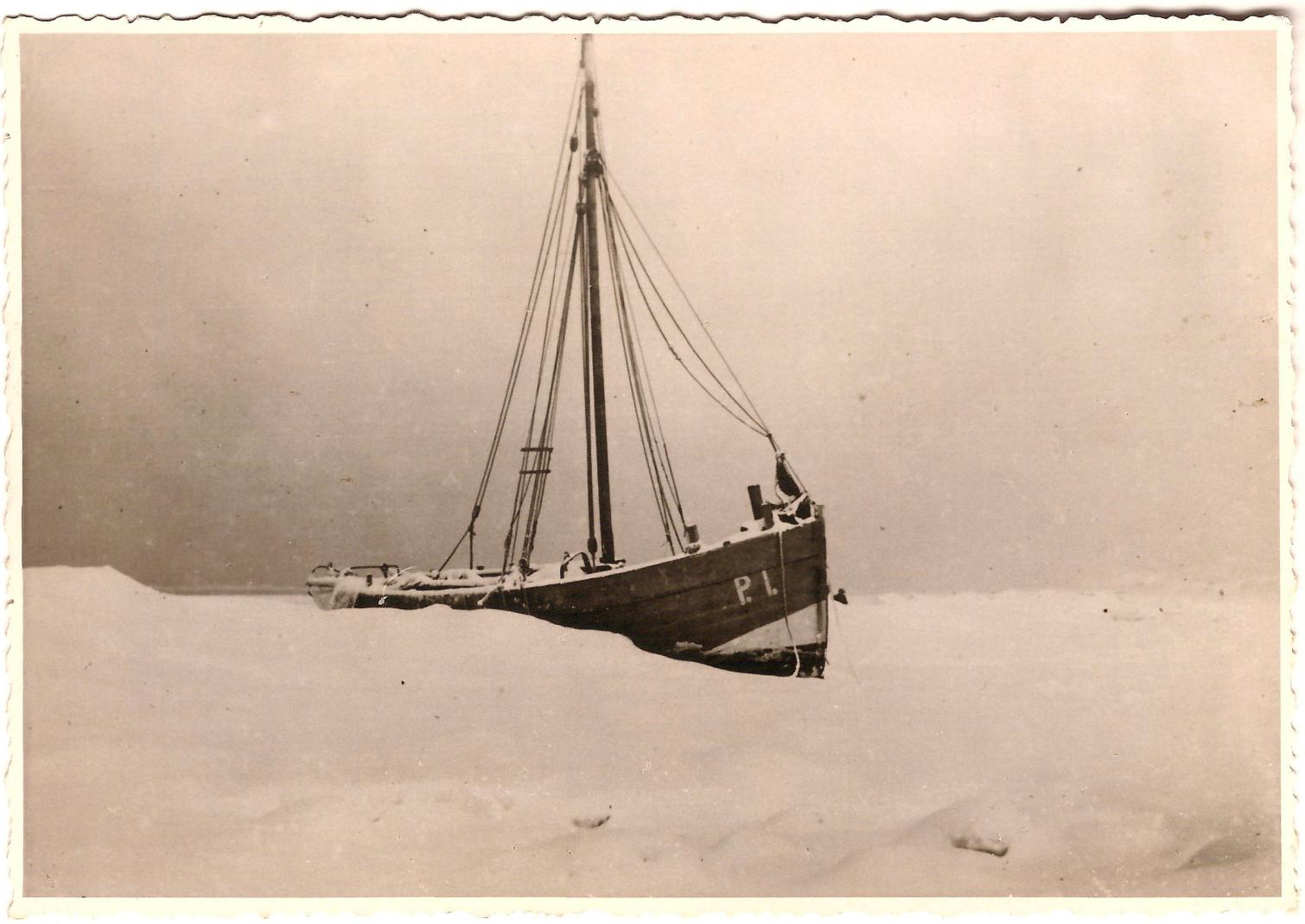 De pannepot P1 ligt roerloos tussen het ijs in de harde winter van 1928-1929.