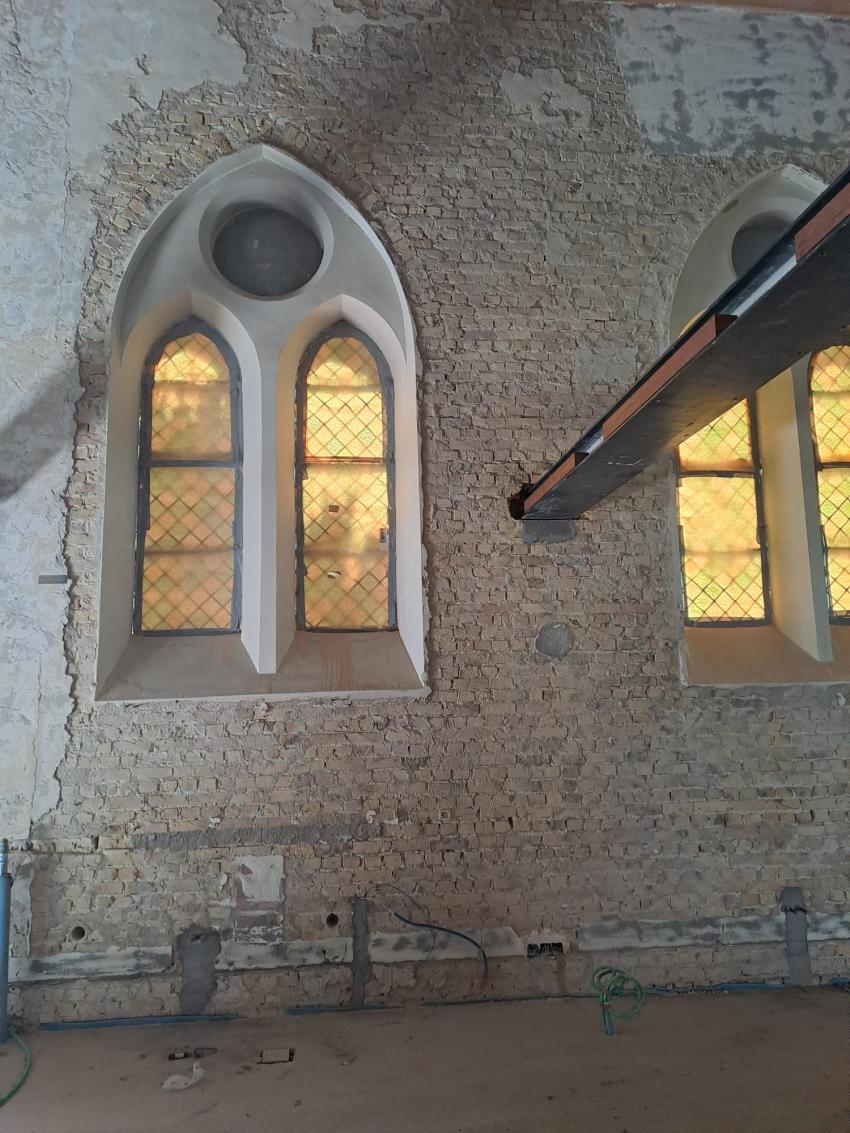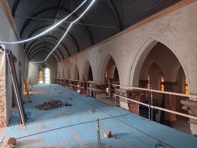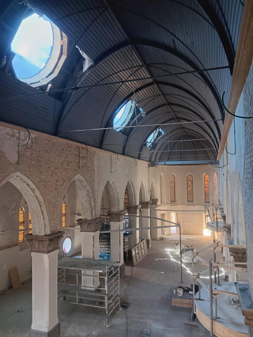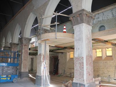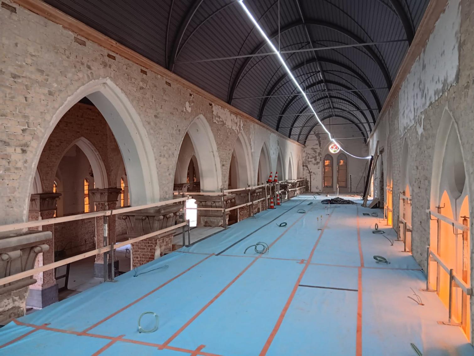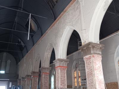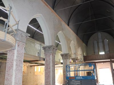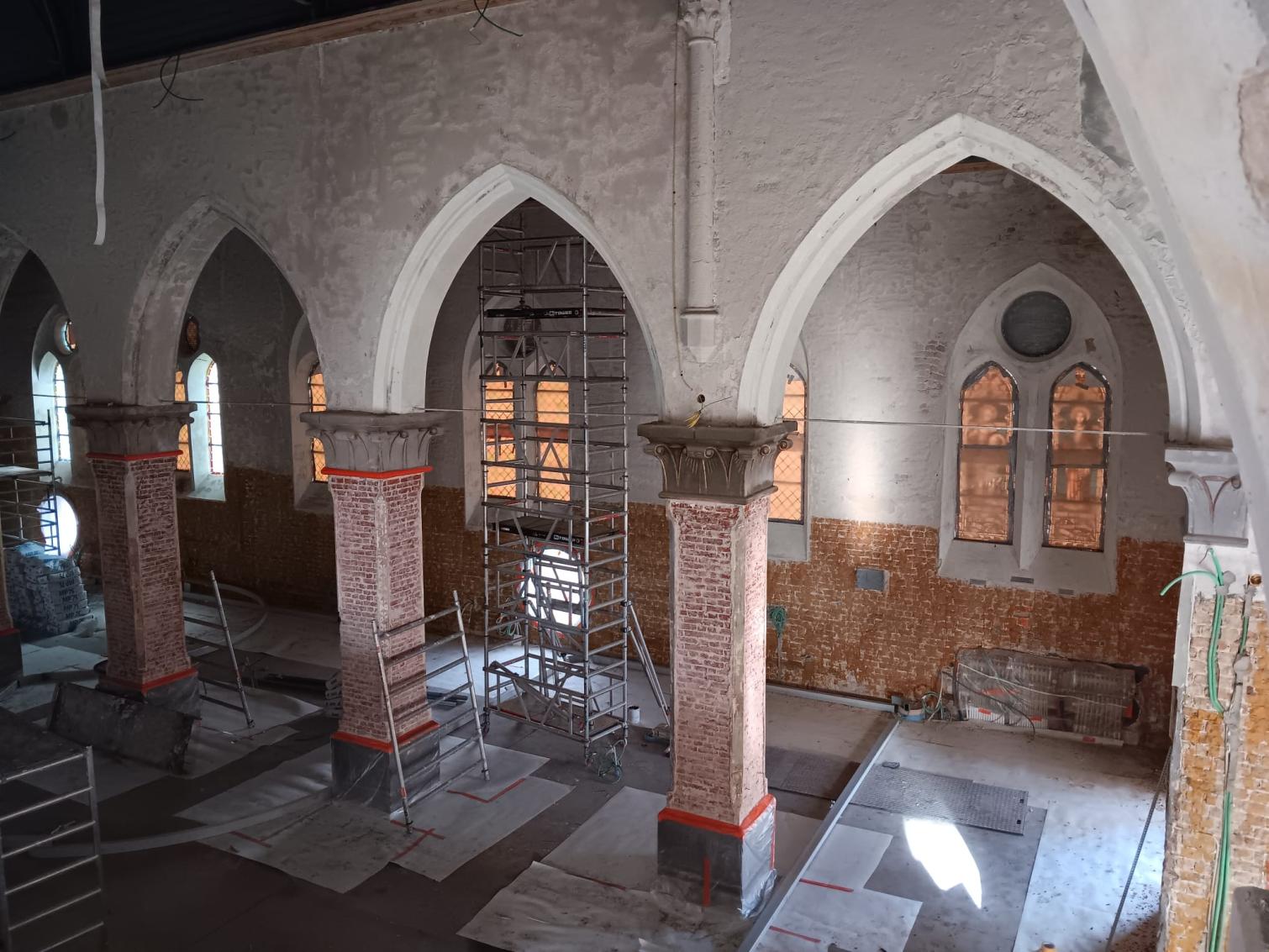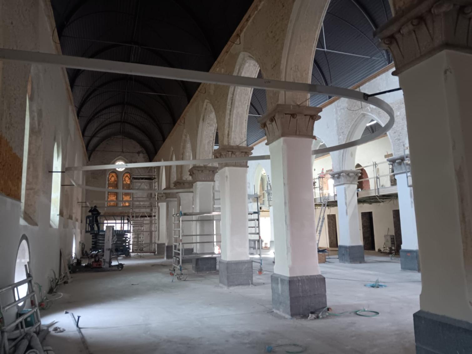 - Binnenin zijn de vlakke pleisterwerken in de kerk afgerond. De akoestische pleisterwerken op grotere hoogte volgen na nieuwjaar.