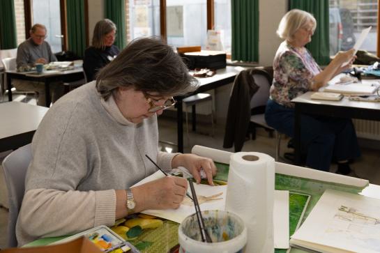 Deze cursus richt zich op het basisschetsen met penseel, mengen van kleuren vanuit het basispalet, de waarde van grijstinten, compositie en opbouw van het schilderij, perspectieven... Ook de drogenaaldets, de linoleum, houtsnede en de monotype komen aan bod.