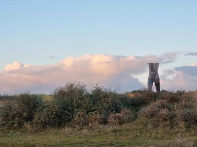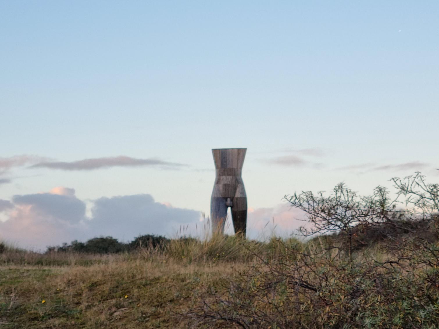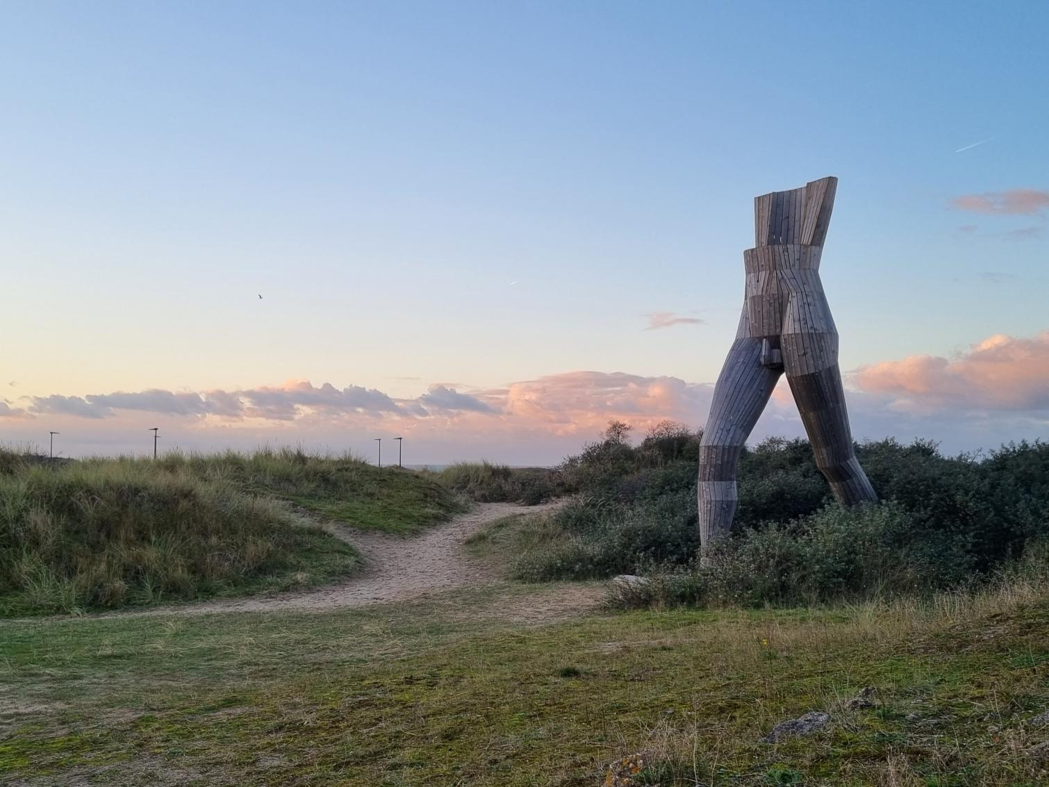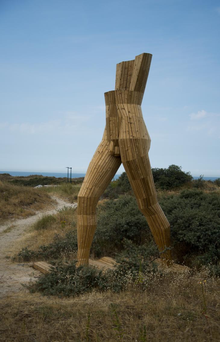 Met zijn hoogte van bijna 7 meter staat hij aan de zeereep, alsof hij net uit zee komt wandelen. De torso van deze gigant is tot zetel getransformeerd en is een afspiegeling van de Christophorus figuur, gebaseerd op het legendarische verhaal van de reus die pelgrims over een wijde gevaarlijke rivier droeg. Hij is de grote grensoverschrijder in een veranderlijk overgangsgebied tussen land en water, tussen vast en vloeibaar. Christophorus past dus perfect bij de kustomgeving. Door de jaren heen kreeg het hout van de wadende reus een prachtige grijze patina.