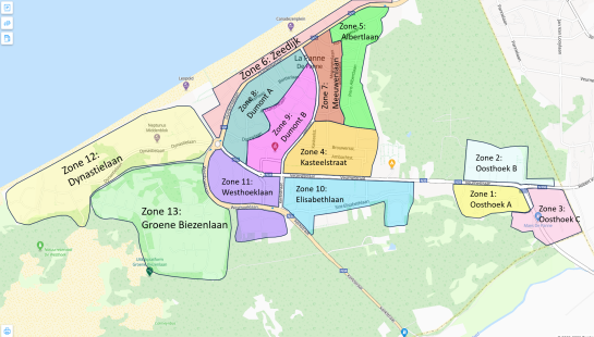 - Lindenlaan, Schoolweg, Doktersweg, Thiriarweg, Blondéweg, Hoge Duinenlaan, Kykhillweg, Visserslaan (tussen Zeelaan en A. Dumontlaan), Zeekruisdoornweg, Bortierlaan (Zeelaan tot A. Dumontlaan) (Parkeren: Koningsplein, Zeelaan, Duinkerkelaan)